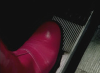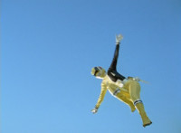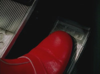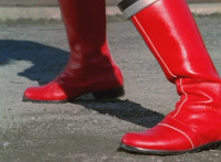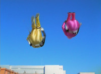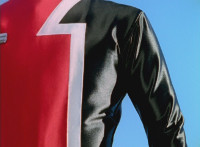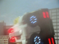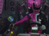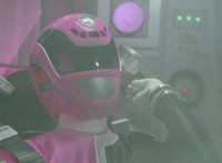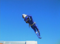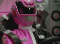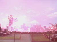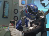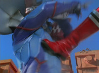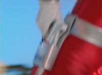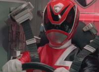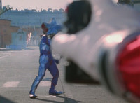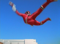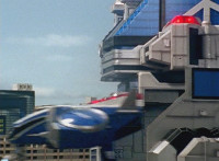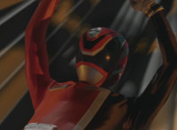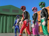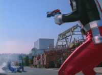 Cuts follow-up of Rangers in the city departing to go into their Zords, leaving Red behind. |