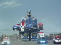 Cockpit shots are shortened; the last few Megazord shots are also shortened, plus are textless, unlike source; final shot has comic panel lines added between each cockpit. |