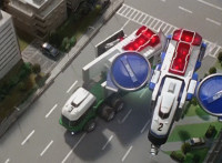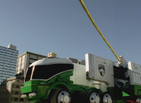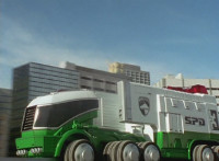 The four Delta Runners head down the street together, until Pink pumps her brakes and Delta Runner 5 comes to a stop. Pink presses a button, and a large LED display screen folds up and has a red stop image, with a monster emoji flashing. Drill Robot ignores this symbol and drives onward, pushing Delta Runner 5 backwards until it backs off. Pink slaps her fist against her steering wheel in disappointment. Delta Runner 3 rolls in, Green gesturing his hand, as the Mega Blaster slides out its side compartment and fires a rope at Drill Robot, failing to ensnare it in the rope, which sparkily bounces off the Robot's drill tips. Praxis drives onward undeterred. |
