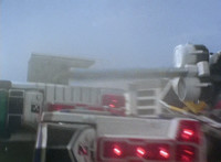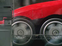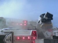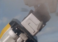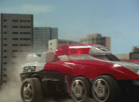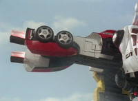 Delta Runner 4 plows through debris, Yellow nod-talking, Praxis reacts, as Delta Runner 4 slams into Drill Robot's left foot, getting hung up for a moment, before getting flipped off of it. Delta Runner 4 rolls off, Yellow reacting. Blue responds from his Zord. |