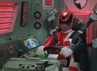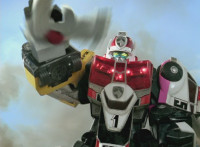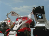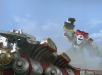 Drill Robot rolls toward Delta Squad Megazord. Sharp zoom in on Red speaking. |