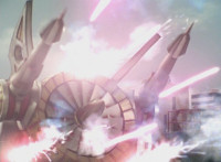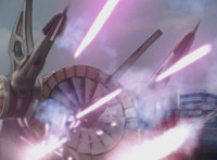 Red yells, then rushes forth in dramatic slow motion, whipping out both of his Delta Blasters. Each Ranger readies their weapon and follows behind. Praxis fires his weapon at them, exploding behind the five SPD Rangers as they race forth. Praxis reacts, as Red leaps up and fires his Blasters at him, spark bursting him. Blue leaps up and twirls his Deltamax Knuckle into Praxis' chest sparkily. Green leaps up and slashes Praxis sparkily with his Deltamax Striker. Yellow & Pink flip over together and sparkily strike Praxis with their Deltamax Strikers. |