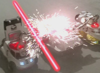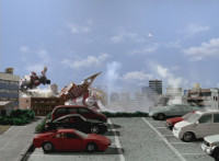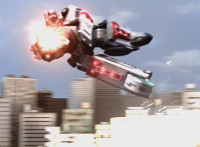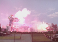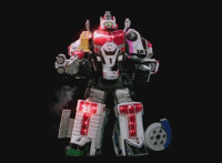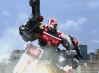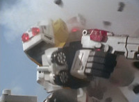 Praxis presses his console control, and fires Drill Robot's lasers forth. Blue grips the control stick and Delta Squad Megazord sideways dives out of the line of fire, firing its blaster as it does so, exploding all around the Robot, until it rolls and lands perfectly. Drill Robot fires some more, Pink speaks and turns the steering wheel, sending Delta Squad Megazord rolling over, firing its blaster until it ends up behind some buildings, Drill Robot exploding. Praxis is shaken up for a moment, then looks around. Drill Robot drives around the building complex that Delta Squad Megazord is hiding behind. |