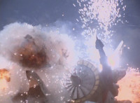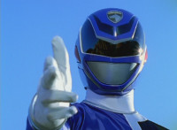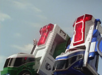 Shot 3 is given comic panel lines between each cockpit; shots 4, 6, 8, 14-16 are recycled, per source; second to last shot cuts before smoke clears and Megazord slowly lowers Blaster down. |