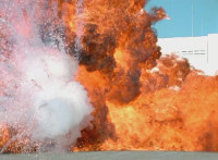 Delta Squad Megazord stands solidly with its Mega Blaster in hand as an explosion erupts to its side. |