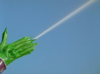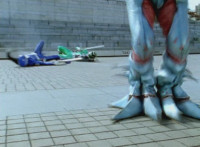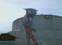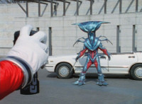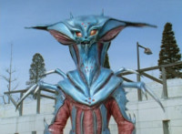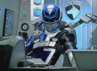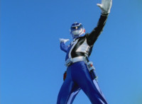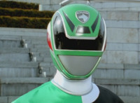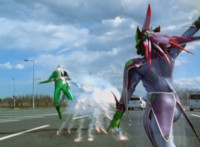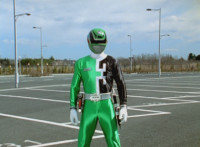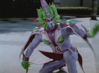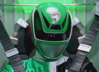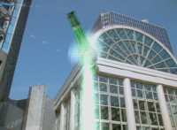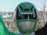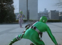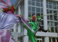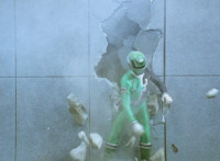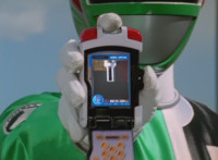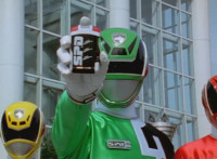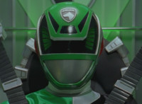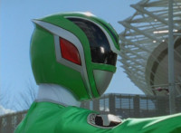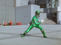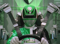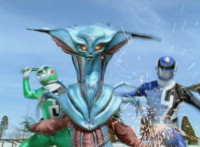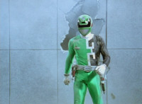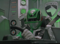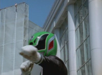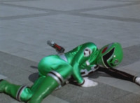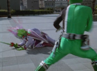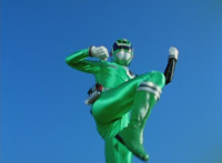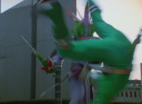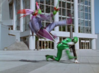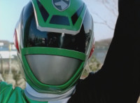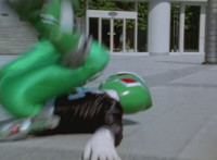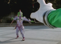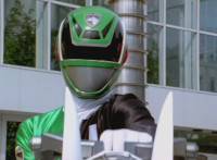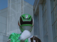 Hydrax falls over, Green poses and leaps up. Hydrax looks up as he begins to corkscrew his whole body. Hydrax fires a water jet at him, causing him to spin perpetually without being cut in half, which stuns her. She stops shooting water, allowing him to stop spinning and kick down at her, sparkily striking down her body down, before landing. The Rangers regroup, Red touching Green and speaking to him. Hydrax recovers, as Green holds his Delta Morpher forth and talks, before finally pressing the button on it and opening it up brightly. |