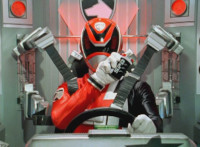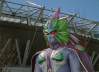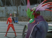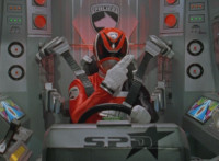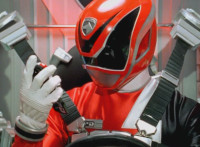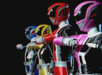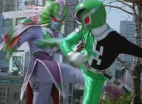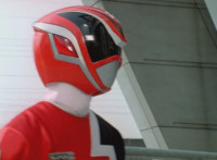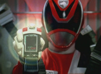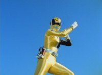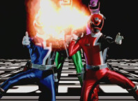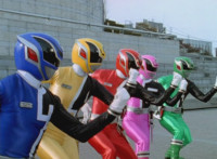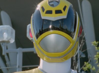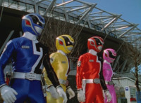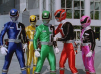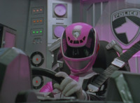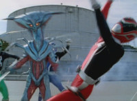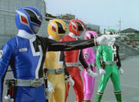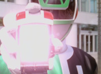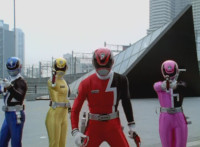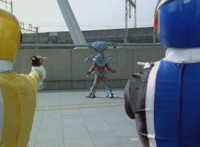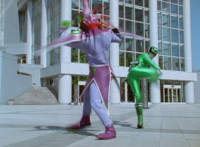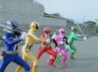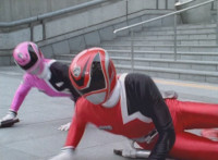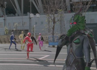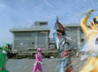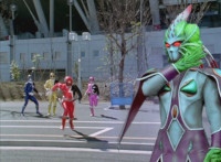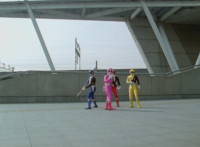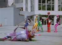 T-Top reacts, as Red speaks, then Blue points. T-Top replies, Green responds, T-Top speaks, Pink reacts, T-Top rushes into battle, the Rangers ready weapons and do the same. T-Top begins to slash at the Rangers, missing twice, then sparkily hitting Yellow. |