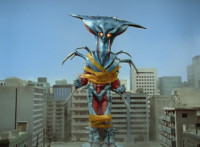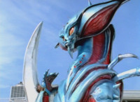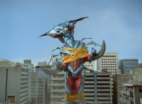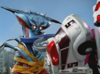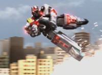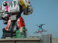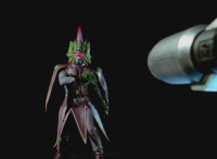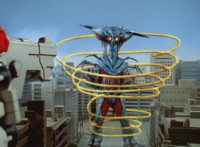 T-Top blocks the blasts with his armblades, then fires eyebeams forth. Delta Squad Megazord sideways dives out of the line of fire, firing its blaster as it does so, bursting around T-Top. |
