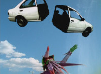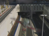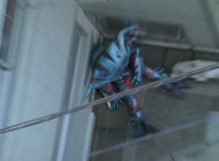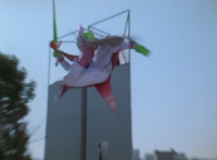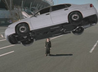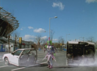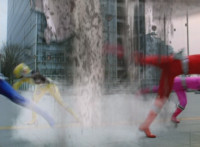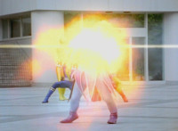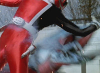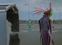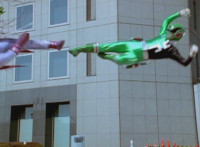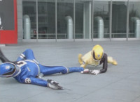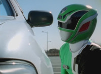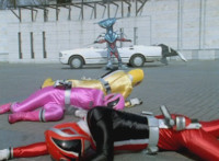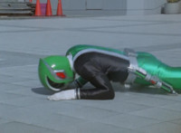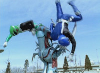 T-Top flips Green & Blue over, they fall, and he leaps up, and energy slashes sparkily through the other three Rangers, landing beside the topless car as they fall. |