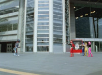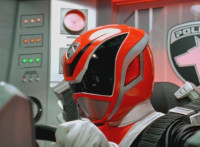 Red unlatches his belt buckle and takes out cuffs, holding them up and talking. T-Top speaks, the four Rangers aim their weapons at him. T-Top speaks and gestures a bit, Red lowers his weapon and speaks as shot pushes in on him. T-Top speaks, then talks more as the Rangers listen and keep their weapons aimed at him. Pink lowers her's, T-Top talks and gestures his arms angrily. Red lowers his weapon. |