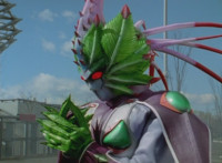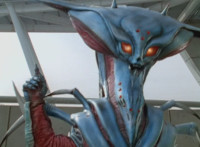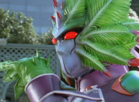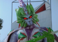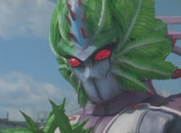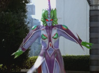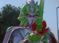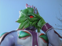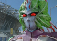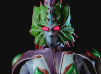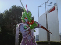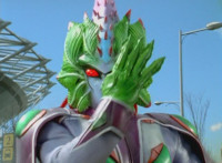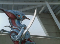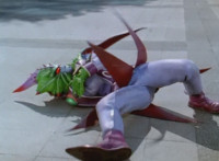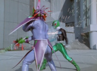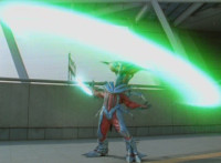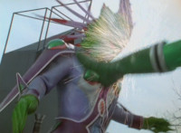 Green falls, Hydrax pulls out a barbed sword and sparkily slashes Green, then begins to roundhouse kick him. |