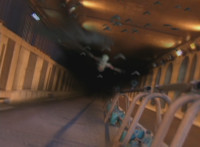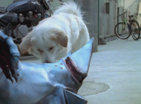 T-Top staggers over to a corner and sits down, talks to himself, then a dog comes over and starts licking his foot. He reacts by reaching out and petting the canine. Meanwhile above him, Broodwing is hanging upside down. |