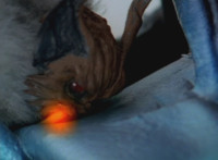 Broodwing opens his three eyes, glowing initially. Zoom out as he hangs upside down in a tunnel, he opens his wings and flocks of bats fly forth, as he flies along with them, exiting the tunnel and flying off into the air. |