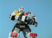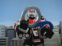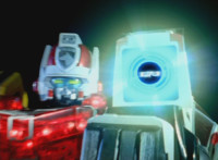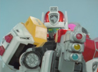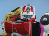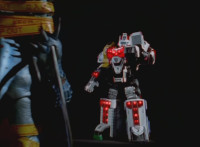 Yellow points then shifts her side gear down, causing Delta Squad Megazord to aim its Blaster forth and fires yellow caution tape around T-Top, wrapping him in it. Red aims his Delta Morpher forth, the Megazord turns its left arm display forth at the tied-up T-Top, zoom in on the Megazord as Red opens his Morpher, causing the arm display to light up. |
