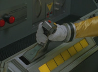 The Canine Cannon lands in the Rangers' clutches, Hydrax reacting, Green speaks and prepares to fire. |