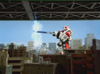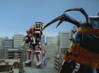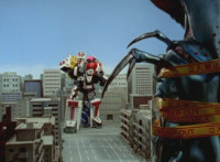 Cuts follow-ups of T-Top racing at Megazord slashing wildly. |