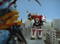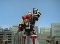 Giant T-Top turns to face Delta Squad Megazord, as it aims its Mega Blaster at him. |