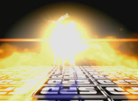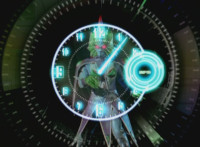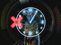 Now against a black backdrop, Hydrax finds herself standing in front of a clockface and two alternating X or O symbols. Green keeps holding his Delta Morpher forth, until it flashes with a red X. His teammates salute, Hydrax reacts, as Green lowers his Morpher, and nod-talks as he raises the RIC bite bone thing, tossing it skyward. |