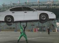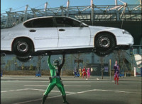 Green lifts the car over his head as Diane and the Rangers watch. |