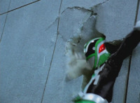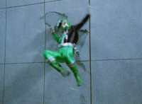 In front of Hydrax, Green flips over and falls down again. Hydrax pauses, then leaps up and corkscrew kicks into him, sending him flying into a wall, which he smashes through. Hydrax laughs at his plight. |