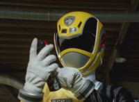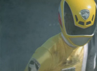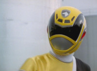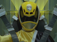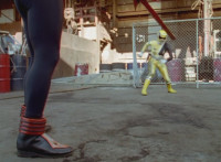 Cuts follow-ups of Yellow leaping up and kicking two Krybots at once. |