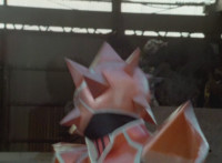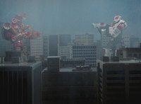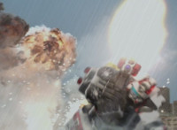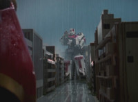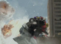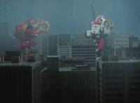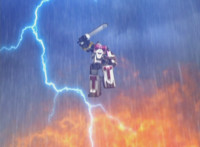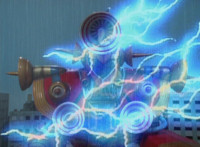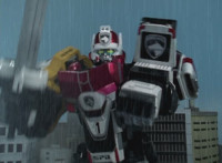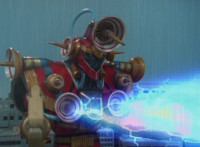 Clouds in the sky suddenly turn dark and stormy, rain falling on the pavement, as Delta Squad Megazord faces Dish Robot across the city. Bugglesworth talks excitedly, zoom out as Dish Robot stands ready. The Megazord steps forth one step, zoom in on Yellow nod-talking in her cockpit. Dish Robot fires blue electricity from its breast dishes, Yellow turns her wheel, and Delta Squad Megazord sideways dives out of the line of fire, firing its blaster as it does so, bursting Dish Robot, then rolls and lands perfectly. Bugglesworth then grips his control and speaks as shot zooms in. |