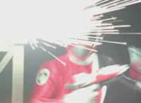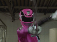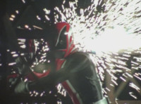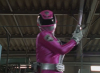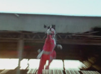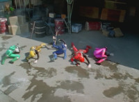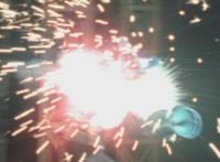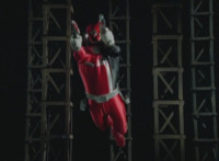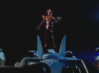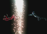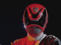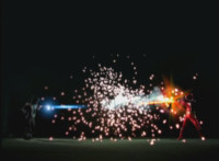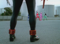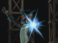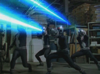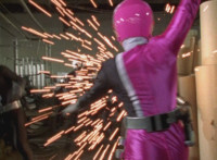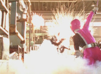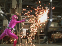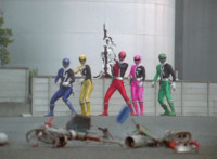 Bluehead and Red Ranger fire upon each other, spark bursting between the pair, until shots ricochet up and cut a wire, raining sparkles down as they both leap up and begin to fire on each other in midair. Red suddenly raises up and kicks his legs forth, hitting Bluehead sparkily until he's flung back through the hole in the wall. Red leaps in and lands outside, as his teammates regroup around him to face Orangehead, who then speaks. |