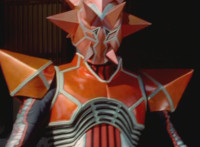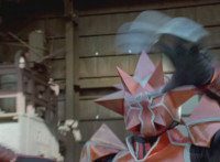 Orangehead's orange lightning crackle and the Rangers' Canine Cannon blast have a tug of war for a bit, with Orangehead's energy almost overcoming the Rangers, Orangehead speaking, then Red replies, and the Canine Cannon blast overtakes Orangehead's bolt, vaporizing Orangehead, who falls to pieces before the Rangers as they pose with their Canine Cannon. Yellow steps forth and speaks, when suddenly the ground quakes, and she looks upward. |