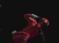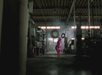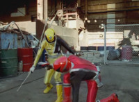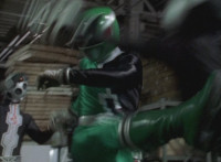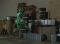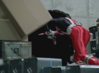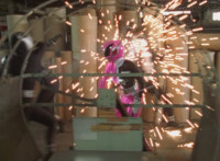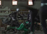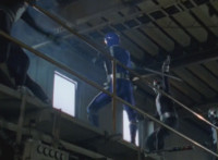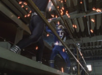 Red leaps into the hole in the wall, rolls into the dark interior, Bluehead fires upon him, spark bursting around the Ranger as he races forth. Red then fires back, spark bursting Bluehead directly. Blue leaps into the warehouse, fights some Krybots with his baton, flipping one over, then zapping another. |