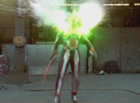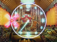 Pink sparkily slashes a few more Krybots, then turns around and stabs one sparkily, sending it flying down, more Krybots approach, so she sparkily slashes at the ground, sending a spark-wave their way. Pink turns around, removes a pair of discs from her baton, then flings them forth, causing an explosion that sends a pair of Krybots flying. |