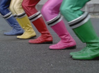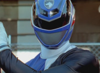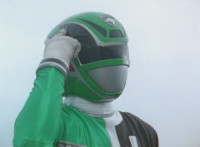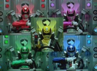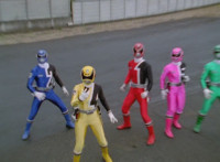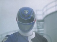 Blue lands before the other four Rangers, he raises his weapon and speaks, Red then replying and pointing forth. |