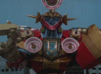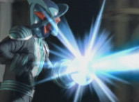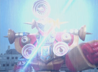 Delta Squad Megazord charges up its Mega Blaster, its tri-colored barrels lighting up colorfully. Numbered colored slices slide in from reverse order of each Ranger in their cockpit, speaking, then aiming forth. Delta Squad Megazord fires its Blaster, spark bursting Dish Robot repeatedly. |