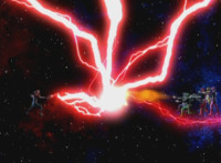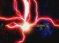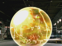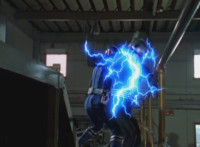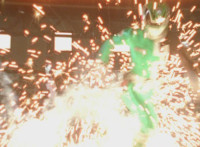 Orangehead turns around and gets zapped sparkily by green energy. |