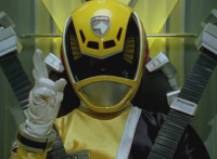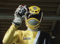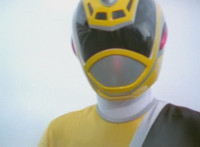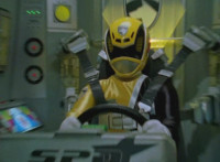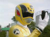 The Canine Cannon lands in the hands of the Rangers. Aimed at Orangehead. Yellow raises an arm and speaks. |
