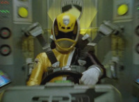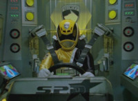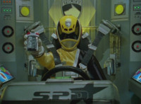 Yellow jerks her wheel to the right, causing Delta Squad Megazord to roll to the side away from explosions while firing its Blaster, bursting Dish Robot, before the Megazord rolls behind a building complex. Bugglesworth blinks up close, then zoom out as Dish Robot fires blue electricity forth, exploding the building complex, sending Delta Squad Megazord, now with Saber in hand, flying skyward. Dish Robot looks up, as Delta Squad Megazord energy slashes its saber downward three times, striking Dish Robot with a superimposed explosion, causing it to stagger back, shaking up Bugglesworth. The Megazord poses with its blade, as Yellow holds her Delta Morpher forth and nod-talks. |