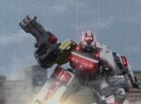Delta Squad Megazord reholsters its Blaster in its leg. |