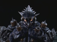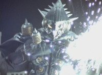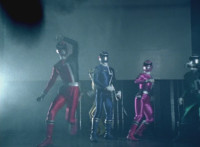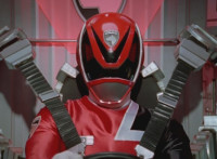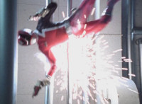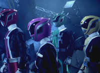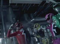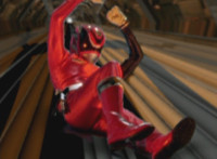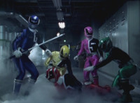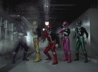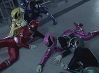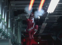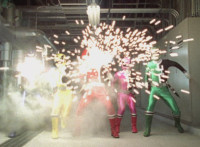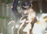 Giganis fires electricity forth, spark bursting the Rangers down. Giganis speaks, then each Ranger recovers, weapons in hand. They charge forth at the monster, with Red striking first. |