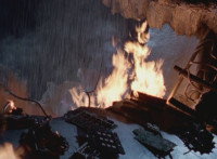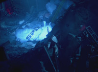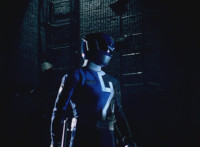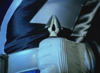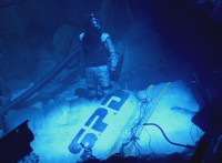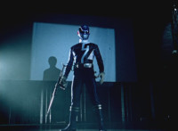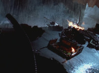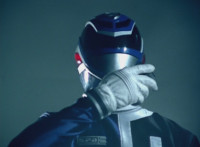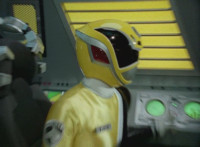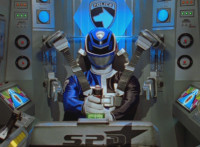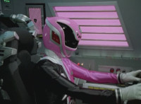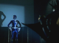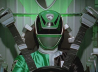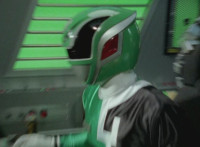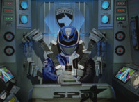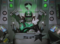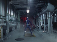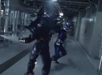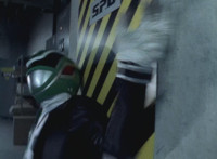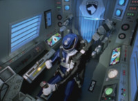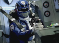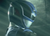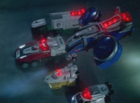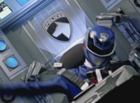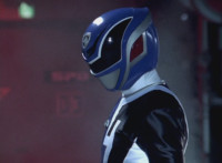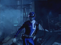 At the fiery crash site, the Delta Squad Megazord approaches, then aims its Blaster down at it. Green gestures his right hand, then reaches over and presses a button, causing the Blaster to fire an ice beam down into the flames, extinguishing the fire on the burning debris. Blue nod-talks in his cockpit, then the Delta Squad Megazord aims its right arm headlights down on the scene, finding a figure crawling from the wreckage. Yellow reacts and nods, as the man stands before the SPD branded debris. Blue quickly unsnaps his buckles, leaps out of the cockpit, lands, then rushes forth, stopping before the man as he removes his vest, talks, sits down on the wreckage, and begins to take off his helmet as the other four Rangers join Blue in watching. |