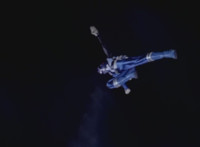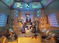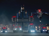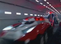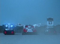 Zoom in on Blue speaking in his cockpit. The five Delta Runners then roll out from the hangar, head down the tunnel in an orderly line, then drive spread out away from Delta Base at night. |