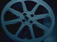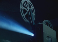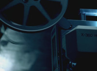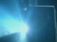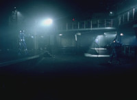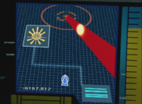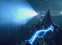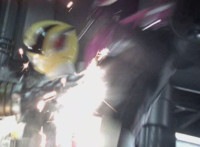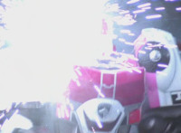 Giganis fires his arm cannon, as Blue finishes firing his Deltamax Blaster. The film on the projector keeps flapping about. |