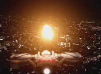 A glowing ship glides into Earth's atmosphere, dropping debris as it does. |