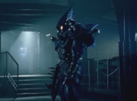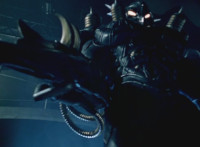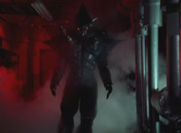 Giganis continues crackling while clutching his chest. Blue shakes his head, and speaks while slowly taking his weapon into his left hand and lowering it, looking at his empty right hand. Giganis crackles and smokes, Blue clenches his fist, then Giganis recovers, still crackling, bursting briefly, as shot pushes in on him and he talks, finally jerking arms. |