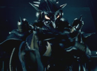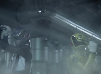 Giganis looks up, seeing Red firing his Blasters at him, bursting the monster back. Red then gets sparkily struck to the side, Blue recovers and goes to strike but gets sparkily struck away by Giganis, who then turns to Red, grabbing him by his collar and flinging him away. He sparkily crashes into some pipes and falls to the floor, his teammates regrouping around him, save for Blue, who rushes over and finds no trace of Giganis on the scene anymore. Red recovers and speaks, then turns and runs the other direction. Blue talks to himself for a moment, then follows. |