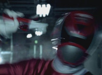 Delta Runner 2 hovers in as the ball of light crashes in the city explosively before it. The flames illuminate his cockpit, as Blue presses some buttons, causing his four teammates' cockpit shots to cut in as they gesture arms in unison. |