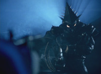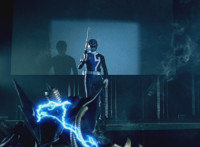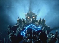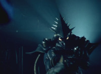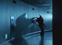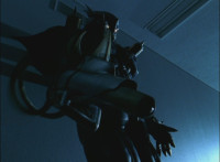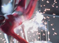 Blue & Giganis remain standing across from each other, weapons drawn and spent. A quick close-up of Blue, then Giganis begins to crackle, doubling over, as Blue raises his weapon victoriously. |
