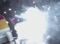 Giganis finishes sparkily bashing Red, Blue dodges his attack, then he slams sparkily into Green, sending him flying into the wall. Giganis sparkily bashes Yellow & Pink down, but suddenly turns from the downed trio to see Blue slashing his blade forth. Giganis blocks his blade and his kick, then sparkily strikes back, flipping Blue over. |