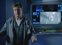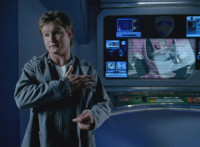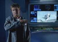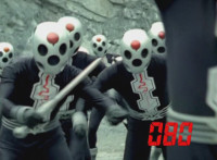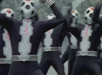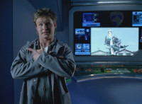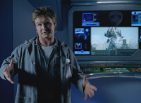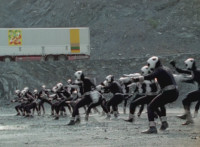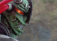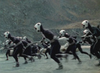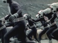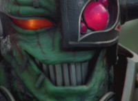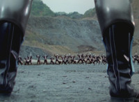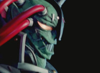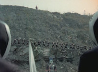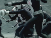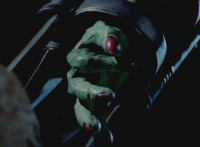 Push in on General Benaag talking and gesturing, Krybots leap over the camera, the dozens of them landing between Benaag and Doggie, spreading out into a wall of Krybots. |