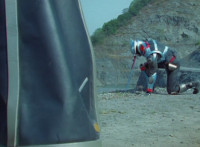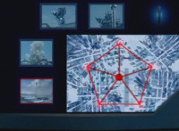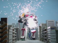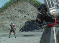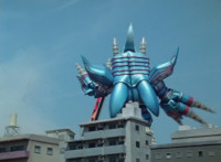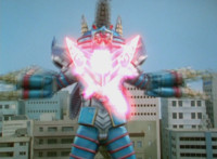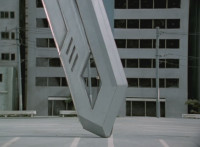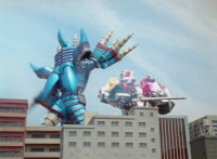 Pan across the city to Delta Squad Megazord, aiming its Mega Blaster at the ground, zoom in on Red talking, then quick extreme close-ups of each Ranger nodding. The Megazord braces its weapon, as dust sprays upward from the ground before it and another drill tower rises up. |