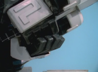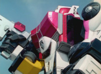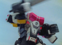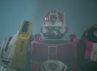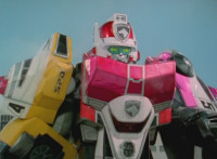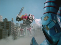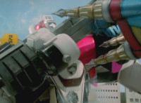 Cuts quick reactions of each Ranger between shots 1 & 2; cuts follow-ups of Megazord pulling out Saber and sparkily slashing the Robot. |