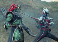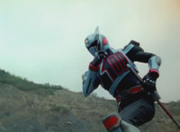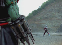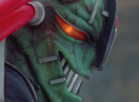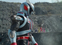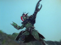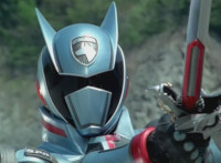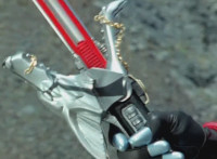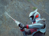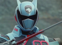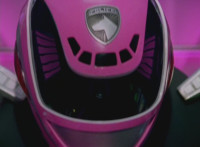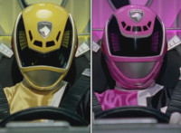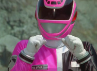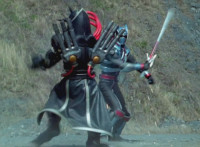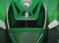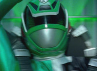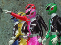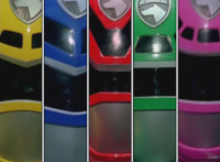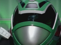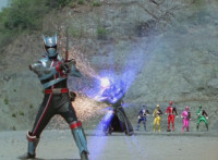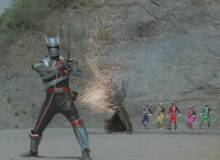 Shadow resheathes his saber, then grips his fist triumphantly. Each Ranger reacts, until Green talks to his teammates, everyone glances about, when Red points forth. |